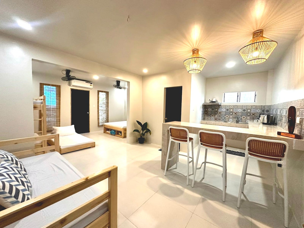 Room 7 Details – Stay for 6-8 pax ✓ Room has 1 double size bunk bed and 2 extra mattress (linen, pillows & extra mattress provided) ✓ With Private bathroom & terrace ✓ With Air-conditioned + wall fan ✓ Own kitchen access (with utensils) ✓ With complimentary pool access ✓ Pet-friendly ✓ Free WiFi & CCTV security ✓ Gated parking & generator backup incase of power interruption or low voltage ⚠️ 3-min walk to the beach (not beachfront) ⚠️ No toiletries or bath towels provided.