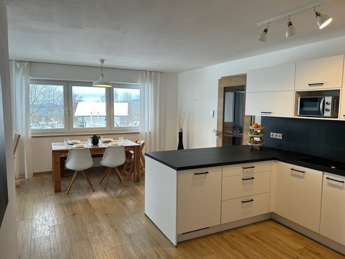 Holiday happiness on the edge of the forest ✨ Get out of the daily grind and into nature! Our modern apartment, completed in 2023, is idyllically located on the edge of the forest, in the middle of a Christmas tree plantation. Enjoy light-flooded rooms and top amenities: • Room for everyone: 2 bedrooms & open kitchen with sofa bed. • Comfort: bathroom + separate toilet. • Extra bonus: Larger group? Another apartment (6 beds) is in the same house!