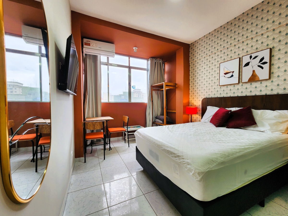 Kitnet with daily housekeeping one block from Pitangueiras beach, near La Plage shopping mall. Space for up to 4 people, including babies. Air-conditioning. Excellent location, in the center of Guarujá. Supermarkets, bakeries, bars, pharmacies, banks, etc. nearby. Laundry is paid separately at the condominium. Valet. The condominium offers free beach service - chairs and umbrellas. Kitchen utensils (pots, dishes, glasses, cutlery) Swimming pool. New Year's Eve packages available upon request