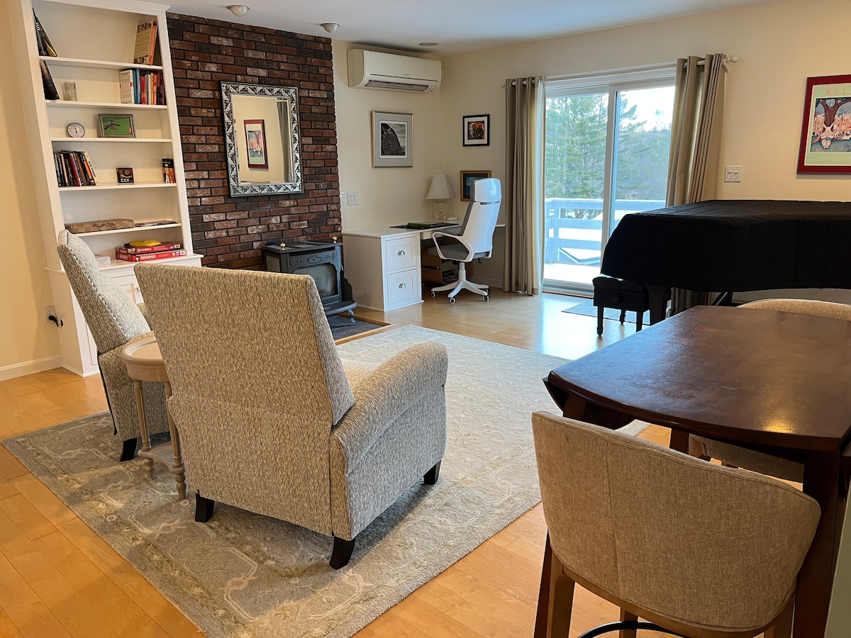 Welcome to our newly renovated studio apartment, nestled among the trees in the serene hills of West Windsor, Vermont. Elevated on the second floor, this separate structure offers a tranquil escape with breathtaking views of Mount Ascutney and our own private pond. Immerse yourself in the comforts of this thoughtfully designed studio apartment, surrounded by the natural beauty of the Vermont landscape. Every detail has been curated to ensure your utmost comfort and enjoyment.