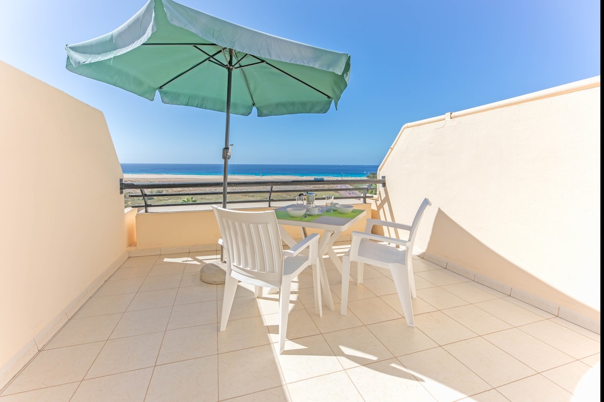 Beautiful and bright two-story penthouse with a very large and sunny terrace on the top floor and wonderful views of the sea and the Jandía beach. The apartment has capacity for 4 people, with 2 bedrooms, 3 bathrooms, 2 terraces, kitchen and living room. Fiber optic Internet (300 symmetrical Mbps) downstairs, weak Wi-Fi signal on the upper terrace.