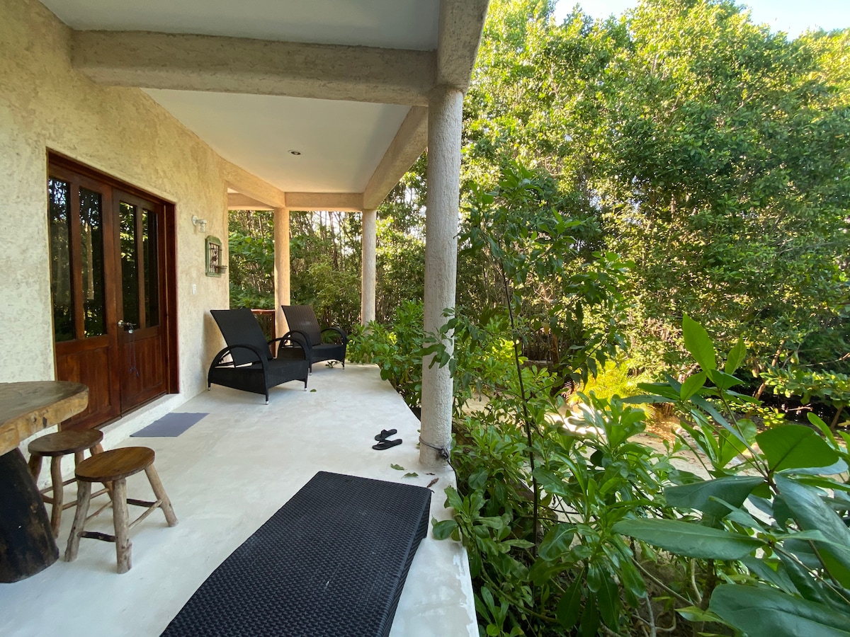 Large 1 bdr apartment Close to beach! “Amazing, quiet, a true hidden gem”, per previous guests. Quiet Large 1 bedroom private apartment, queen mattress, satellite Wifi. AC. Self checkin. Beautiful terrace, & palapa with Yucatan hammocks in tropical jardin. Close to beach - just 2 min walk through palm trees! Your private eco apartment, with queen bed, nice linens, & wooden French double doors to a large terrace. Bar kitchenette. Welcome Basket with free first morning’s coffee!