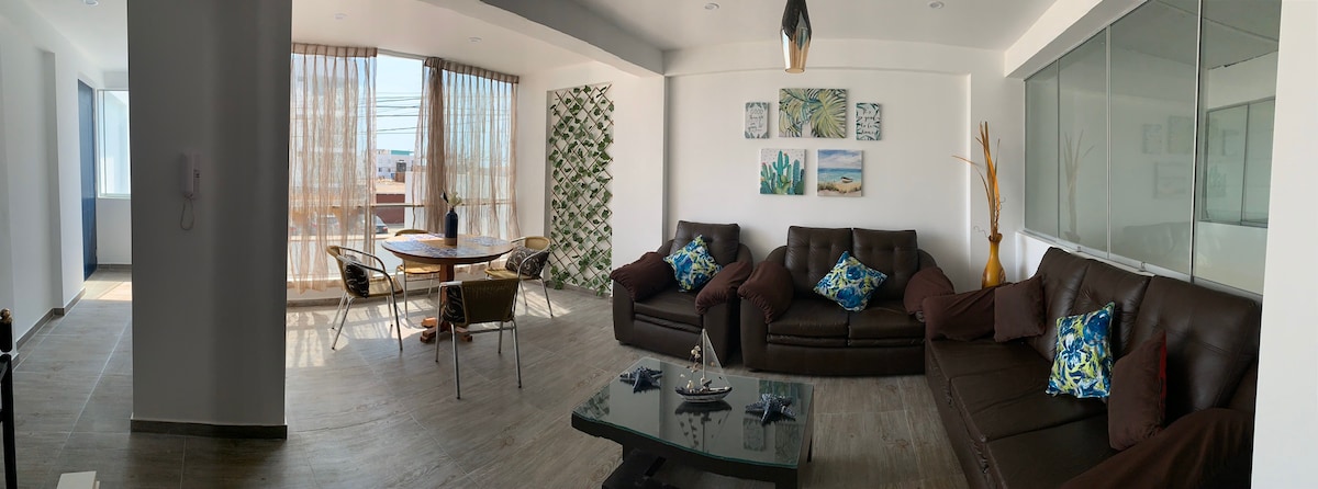 Relájate y disfruta con la familia o amigos en este bello dpto de estreno! Con una linda decoración playera y acogedora❤️ 🏖️☀️🌊👙🏄🍷😎 a un paso del mar! Disfruta desde la terraza la linda vista panorámica del mar y atardeceres inolvidables mientras te bañas en la piscina o tomas sol en la terraza que está totalmente amoblada, tiene un techo sol y sombra; y también puedes hacer una rica parrilla o cilindro Es el Alojamiento perfecto para ti!Máximo para 5 personas Cochera propia Seguridad las 24 hrs