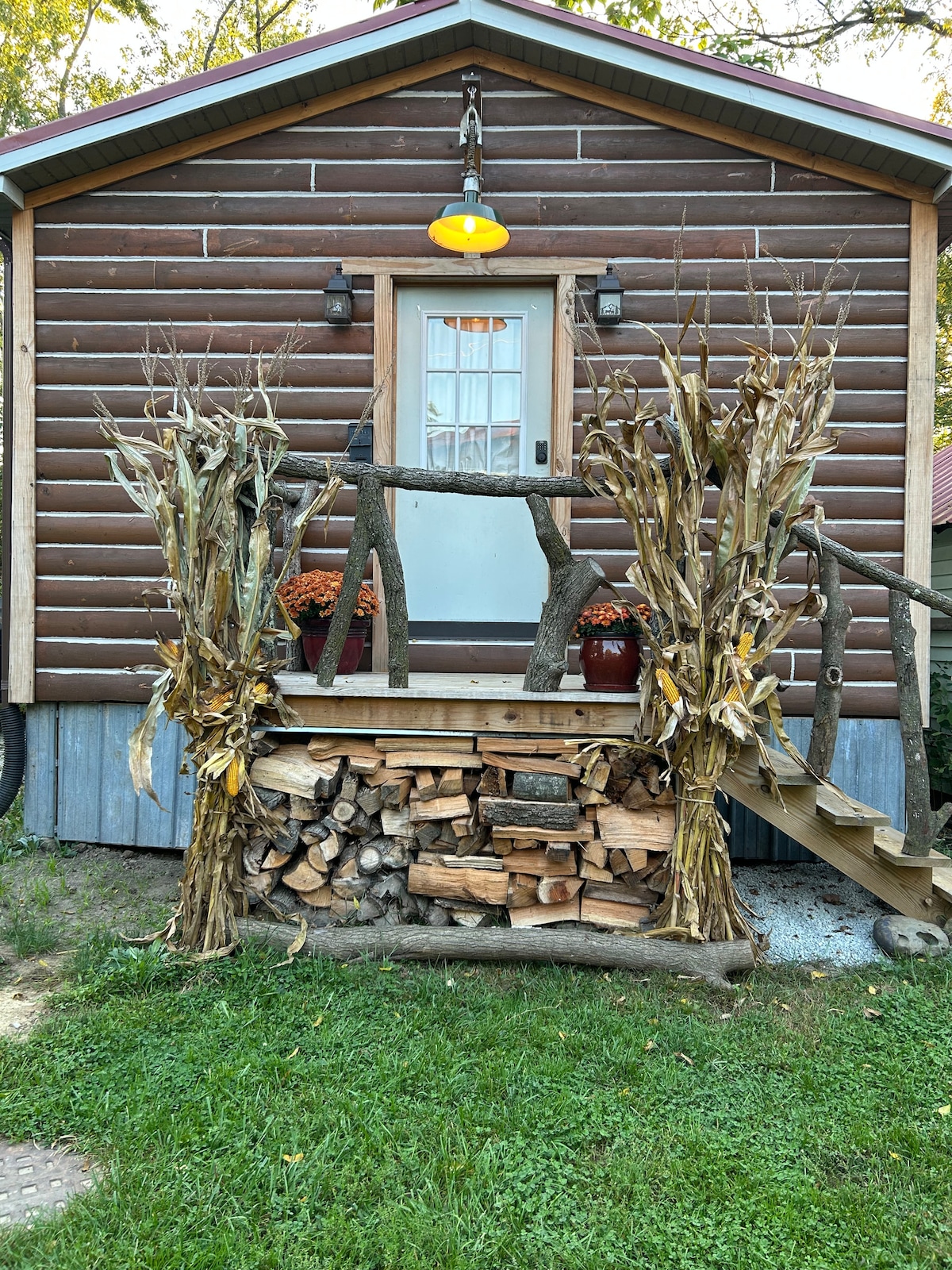 Nurture your most important relationships at this peaceful authentic log cabin, built in 2022, set halfway in the long lane of our 18 acre property. Enjoy privacy with the massive pine trees behind you. Relax on the front porch and watch the sunset beyond the horse pasture and cornfields. The cabin boasts Wi-Fi, TV screen w options,a soaker tub, queen bed, recliners with heating feature, a full kitchen stocked with pots and pans, a washer and dryer. Everything you need for a longer stay.