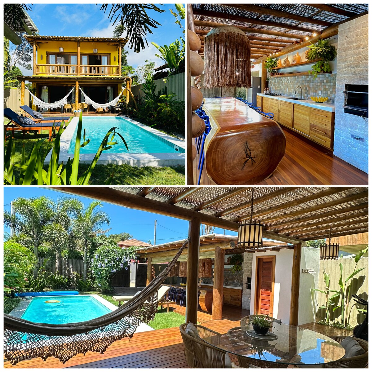 Espelho Beach. It's in the charming VILA, in Cond. Outeiro das Brisas, in front of the Square, square, Empório da Vila. Airy house, garden, hammock area, swimming pool, air-conditioning in the 3 en-suites, closets, equipped kitchen and living room, with good lighting. Close to the overlook on the cliff, church, restaurants, and path to the beach. The condominium's beach club has a children's and adult pool, restaurant, chairs, a few meters from Espelho beach, surrounded by Atlantic Forest and lots of nature.