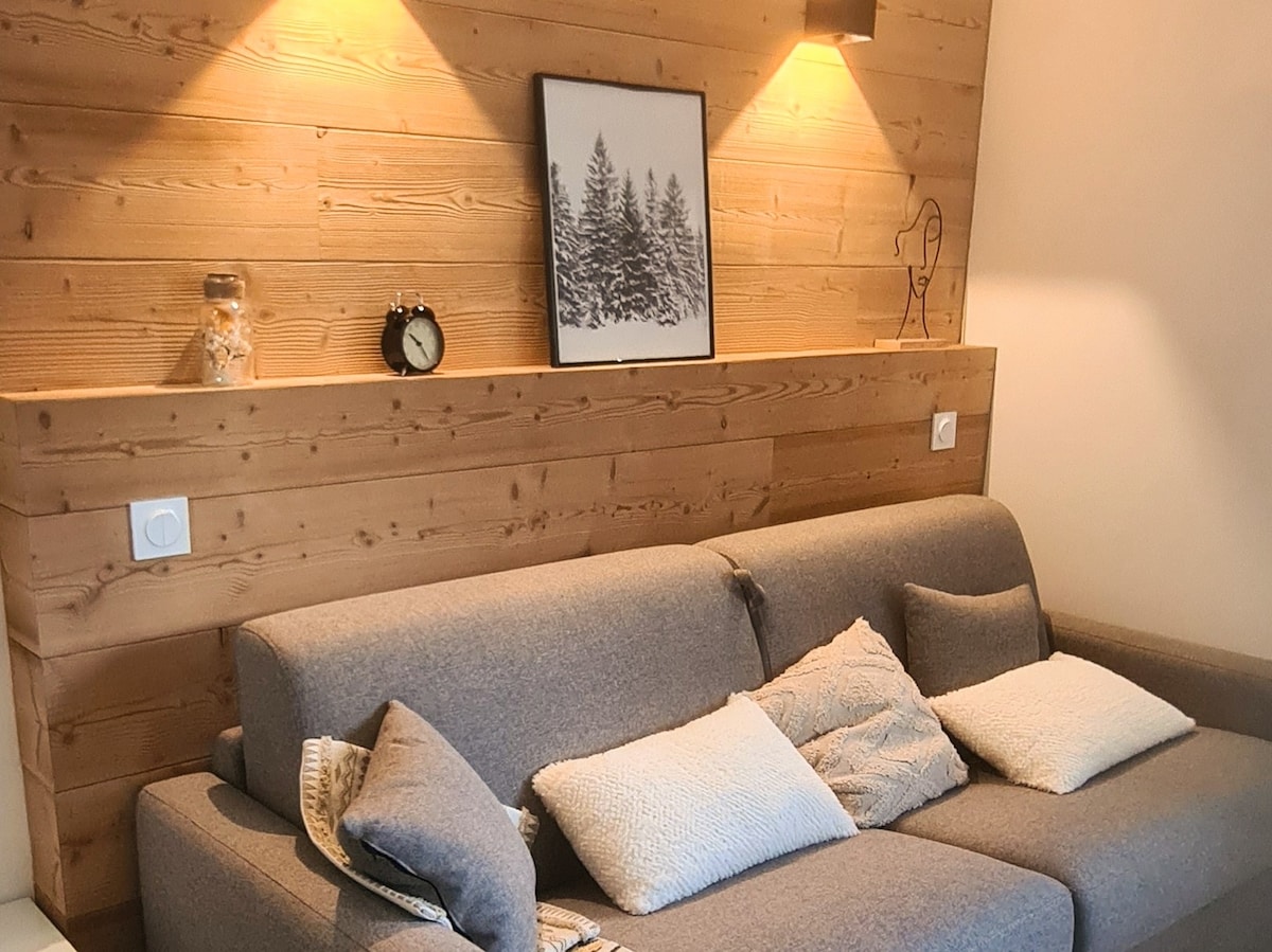 Quiet residence, very small studio 20 m², SE exposure close to all shops, 600 m from the ski lifts, ski bus shuttle 30 m away. Accommodating 2 people, this Savoyard-style studio is fully equipped. American kitchen, washing machine, flat screen, sofa bed 140/190, dressing room, bathroom, toilet and 5 m² balcony with view of Aiguille du Midi in clear weather. Lake, recreation center, children's park 100 m away. If you want to bring your bed linen and towels I'll give you a small discount.