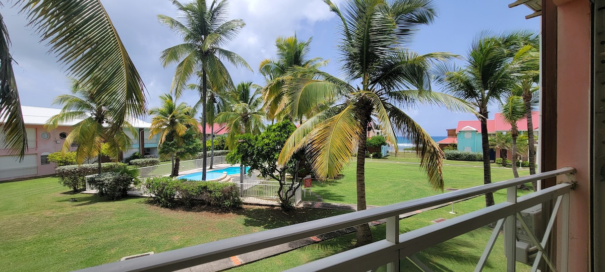 Studio pour 2 personnes ( enfant ou bébé possible avec lit pliant) belle vue mer et piscine avec parking dans résidence sécurisée WIFI/ TV SAT Netflix dans superbe domaine avec plage et piscine, situé à Saint François .2ème et dernier étage de la résidence Corail à l' Anse des Rochers ,face mer et cimes de palmiers, plage de sable blanc à 100 mètres, piscine à 50 mètres. Entièrement rénové dans un esprit design et de charme , climatisé pour votre confort,terrasse loggia avec cuisine équipée.