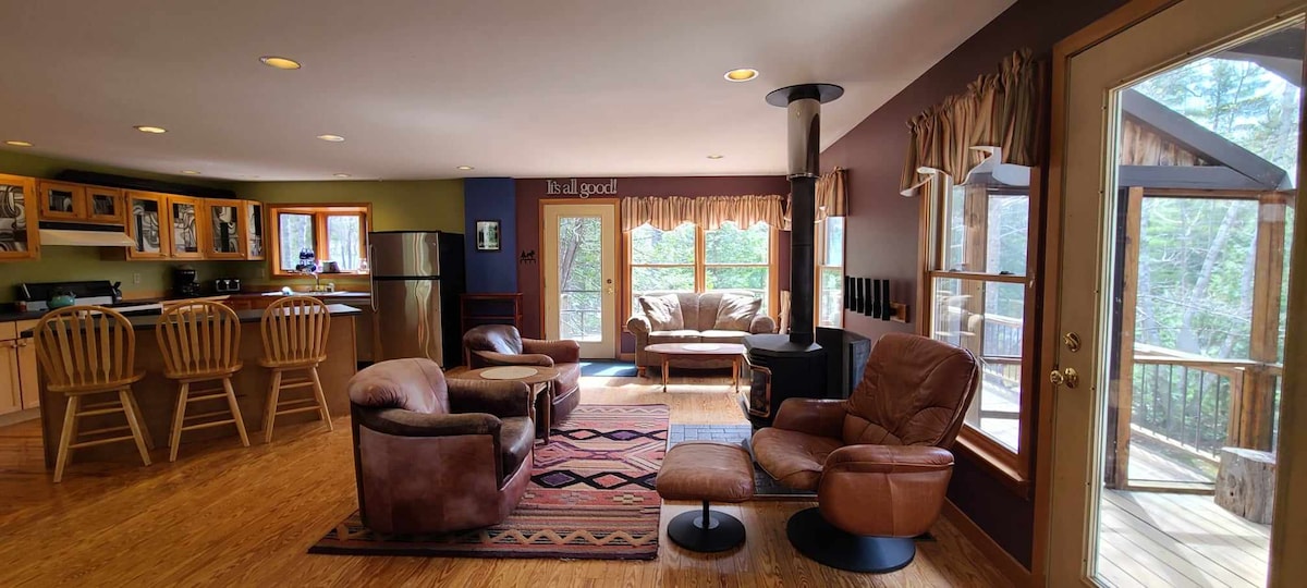You have full access to this spacious house. Enjoy the large kitchen with a food prep island, ample counter space, basic cookware utensils and ingredients for cooking and baking. The dining room table comfortably seats eight. Relax in the living room with a TV monitor for streaming your preferred services, comfy furniture, and a pellet stove. One bedroom is on the ground floor and two upstairs. Living room is 4 steps down from other ground floor areas. There are no TV monitors in bedrooms.