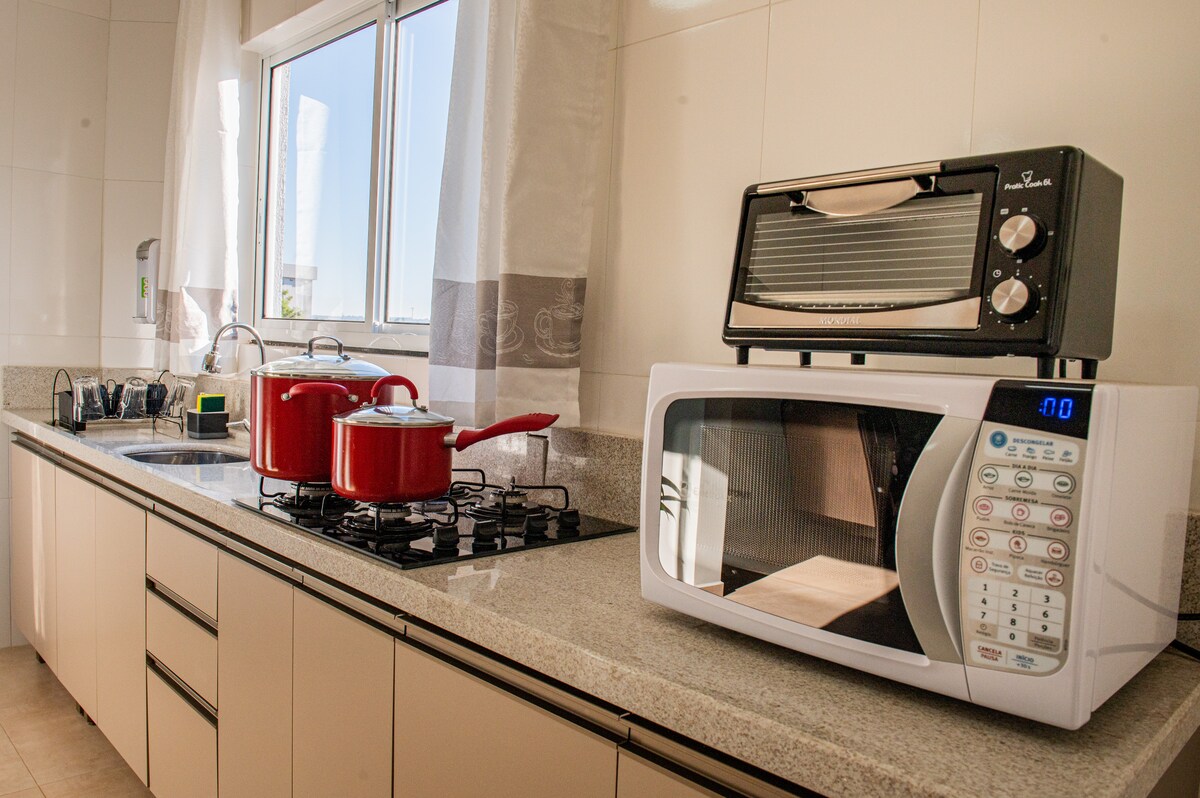 - En-suite with queen size bed, air-conditioning - Bedroom with double bed, TV, air-conditioning and work desk - Balcony with barbecue grill - Living room with retractable sofa and TV - Full kitchen, with fridge, stove, electric oven, microwave, sandwich maker, kettle, blender, pots, dishes and utensils - Dining table with 8 chairs - Washing machine - Bed and bath linens - 500 mb Wi-Fi - 2 covered parking spaces - 2 bathrooms - 1st floor ATTENTION: There are personal belongings on the property.