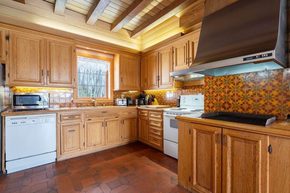 Our Nordic forest chalet is perfect for spending quality time as a couple (or with a kid), or for a work-retreat (with high-speed WiFi). The wooden interior is warm and cozy. The full-height windows offer stunning views over a forested valley. The open-concept kitchen and living room keep you in the conversation while cooking. If you prefer to cook outside, there is a fire pit with a grill and outdoor dining table. Only 70-min drive from Montreal. The lake is a 25-min walk if you park nearby.
