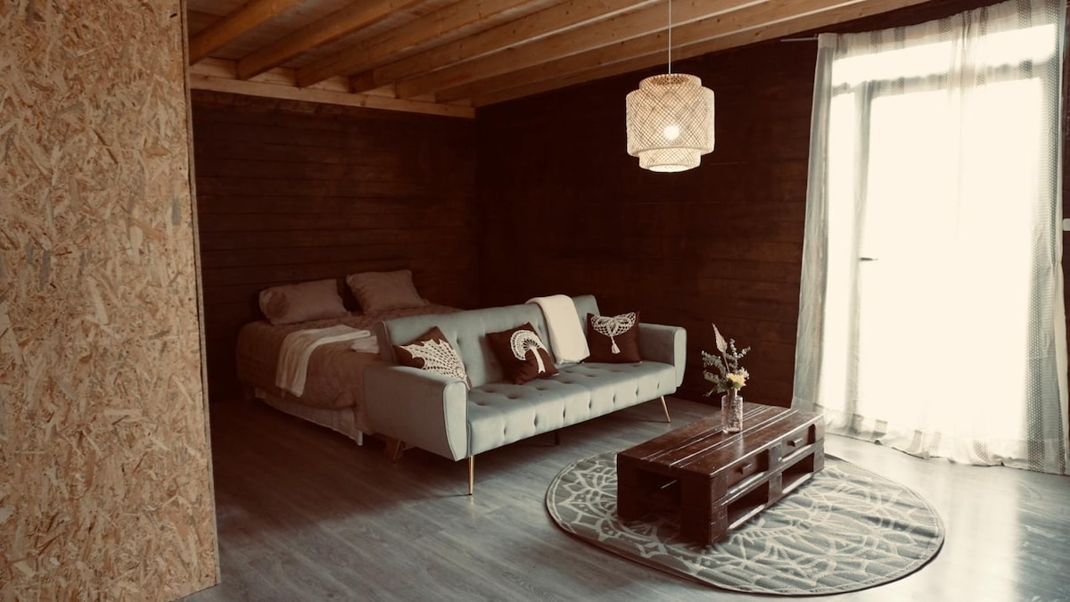 The cabin is located in a beautiful place, just 10 minutes from Santiago de Compostela, in which to spend a quiet and romantic day surrounded by nature next to the Ulla River, in a new concept of rural tourism. With capacity for 2 people* in 27 functional m2, divided into bathroom, bedroom, kitchen, living area, sofa bed, Wi-Fi, air conditioning and an outdoor terrace under birch trees, beech trees, ash….