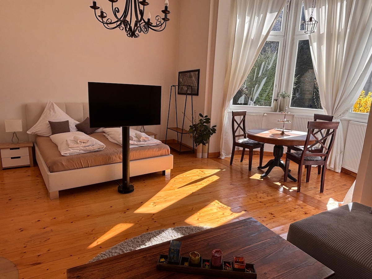 The modern furnished apartment is on the second floor of a romantic half-timbered house from 1865. On 38 m², it comprises a bright living room with kitchenette and balcony, a cozy bedroom and a bathroom with shower tub. The green and white house is in the middle of the old town: it takes less than 10 minutes to get to the sights, shopping, restaurants, bakery and train station, etc.