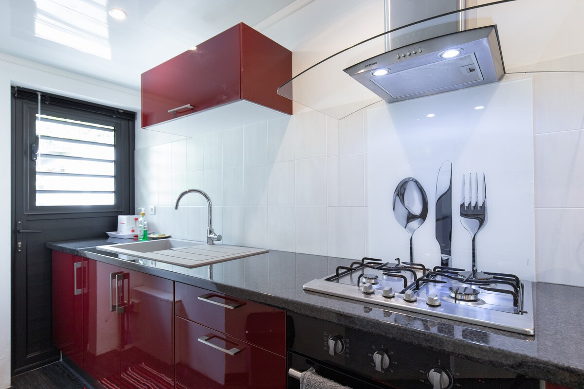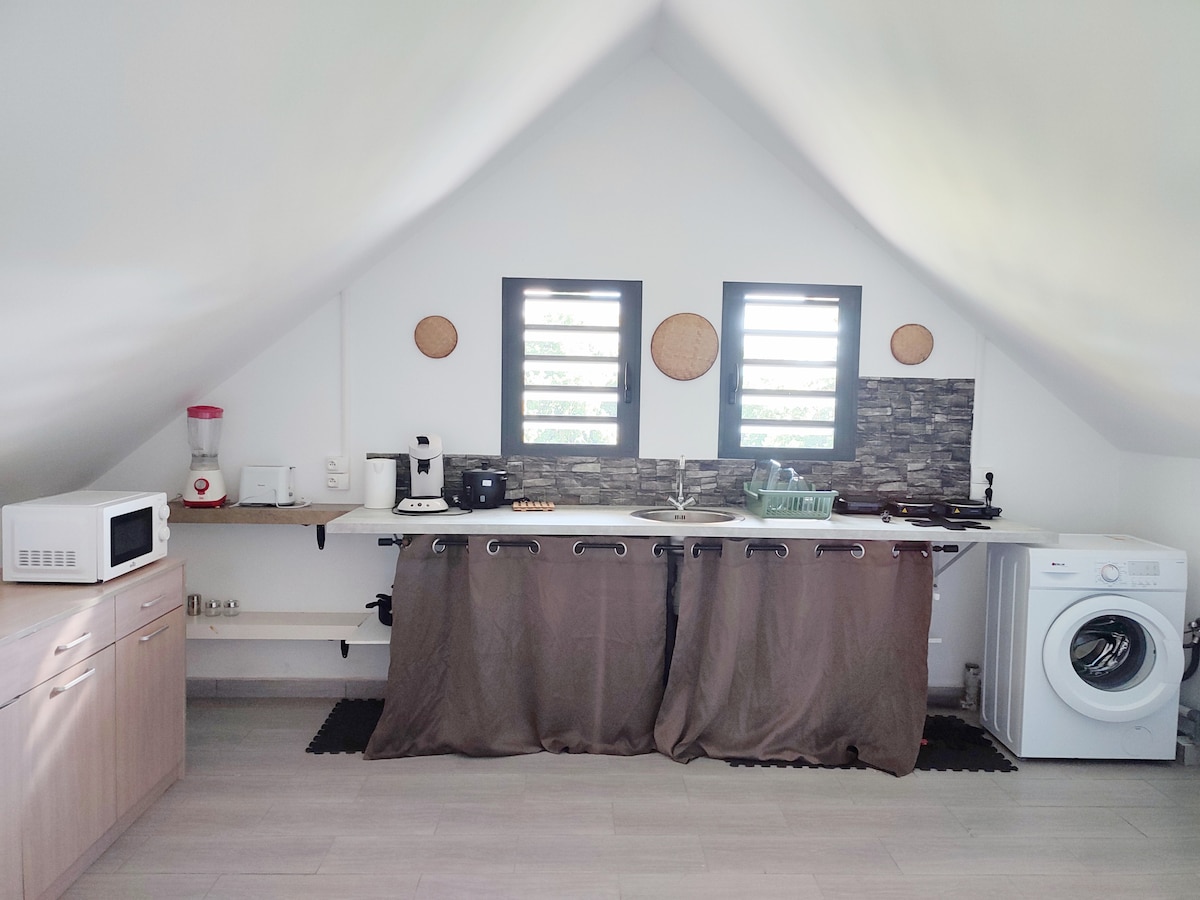 Come and discover the East of Reunion Island with its atypical green landscape, by staying in our fully equipped studio furnished in tamarind wood, located on the road to Salazie. Ideal for your getaways, hikes and beautiful walks. I can also offer you very good typical Reunion dishes on request, do not hesitate you will not regret it, to dine under a beautiful wooden terrace with beautiful vegetation around,... a little punch will be offered to you