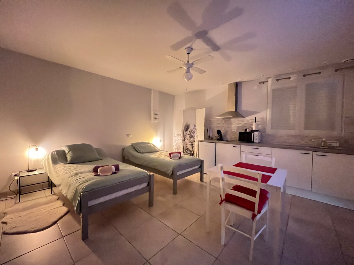 The Basjoo Lodge (33 m²) can accommodate 1 to 4 people. It is located in the countryside, north of the Gironde and has all the necessary comforts: living room, office area, equipped kitchen with dishwasher, living room with sofa bed that converts to 160/200 cm, 1 bedroom of 9 m² with a queen size bed and dressing room, bathroom with toilet, washing machine, Wi-Fi, TV, air conditioning... fenced garden, terrace and private parking. 5 min to all amenities. Access to the A10 highway in 10 minutes. Decreasing rate depending on duration.
