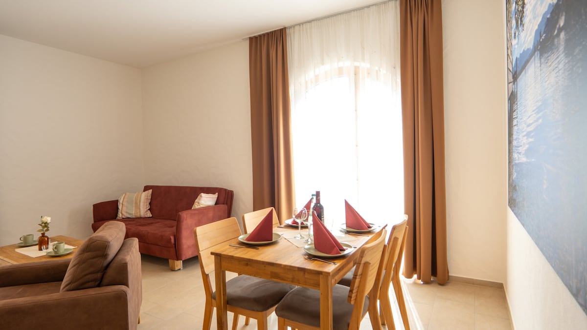 Welcome to our quiet and modern apartment in a remote location. The apartment has a separate entrance and is bright and stylishly furnished. On sunny days, an outdoor seating area invites you to relax. The built-in kitchen is fully equipped (coffee maker, stove, oven, fridge) and the bathroom is spacious and friendly. Amenities also include free Wi-Fi (fiber optic) as well as MagentaTV and Amazon Prime Video.