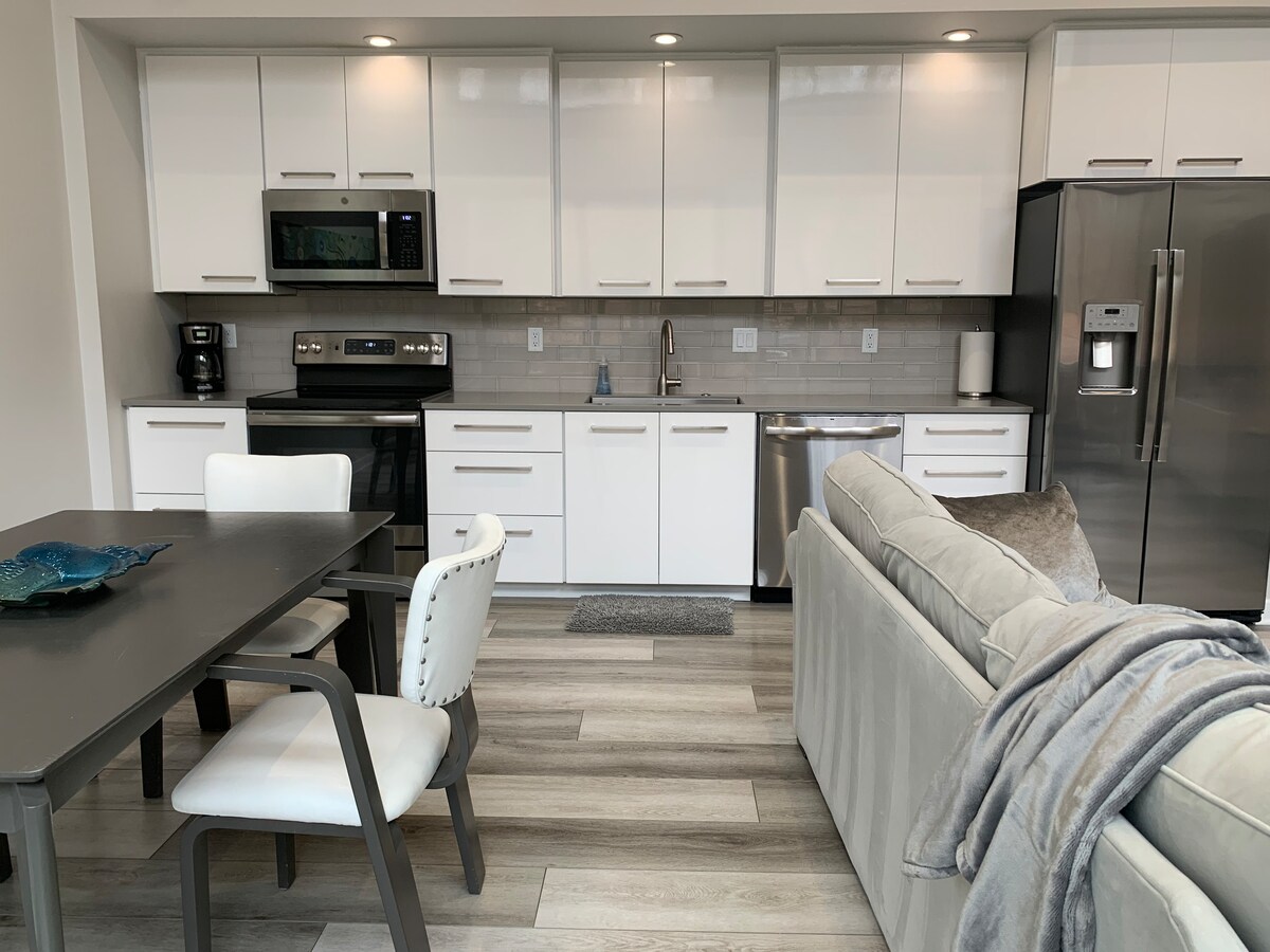 "Rest A While". Enjoy our private guest suite that features a large main living area where the kitchenette and dining area are also located, a separate bedroom and private bath. This suite is located on the lower level of our raised ranch and requires the ability to use six steps. Check yourself in at the private front entrance with keypad. Driveway parking spot with paved lighted walkway to the entrance.
