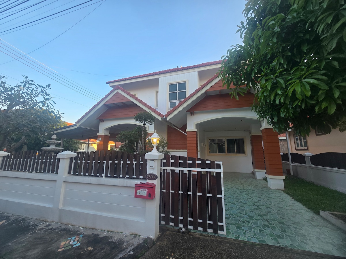 This cozy family home is perfect for short or long stays. It offers 2 bedrooms, 2 bathrooms, and an extra room ideal for work or guests. The living area has a 43" TV and high-speed WiFi, and the kitchen includes a fridge, microwave, and kettle. Located in a quiet villa area with restaurants, massage, mini-shop, swimming pool, fitness, golf, and a coffee house nearby. Just minutes from Kad Farang with great shopping and dining.