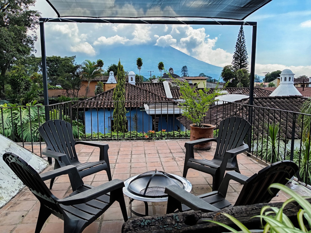 Your home in Antigua, with a view of all three volcanoes. 2 bedrooms, 2 baths. 90 m2 living space, plus 140 m2 rooftop with views of volcanoes. Full kitchen, dining room with expanding table, living room with a fireplace. a private 34 m2 patio with a view of Volcano Agua. My wife and I have travelled around the world with airbnb. Some hosts have made us really welcome. I will do that for you here. I have good reviews on Airbnb for my 4 apartments in this building.