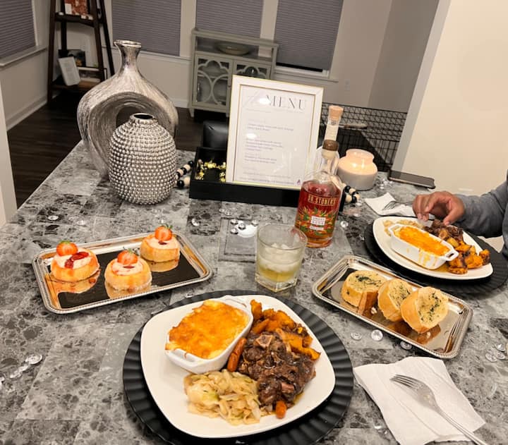 This basic dinner experience includes a thoughtfully crafted menu featuring a starter, main course, and a complementary dessert option. Meals are prepared on-site and designed to provide a comforting, restaurant-quality dining experience in a private setting. You'll be able to select dishes like Bacon Jam Candied Ribs, Smoked 5 Cheese Mac, or Garlic Butter Brussel Sprouts.