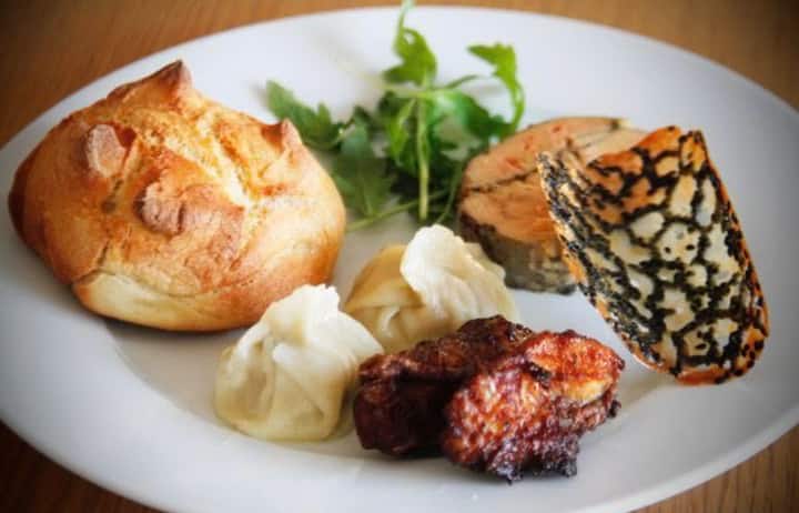Go on a delicious journey through international flavors with kimbap, gyoza, mint beef, foie gras, scallops, steamed bites, vegetables, and seasonal fruits.