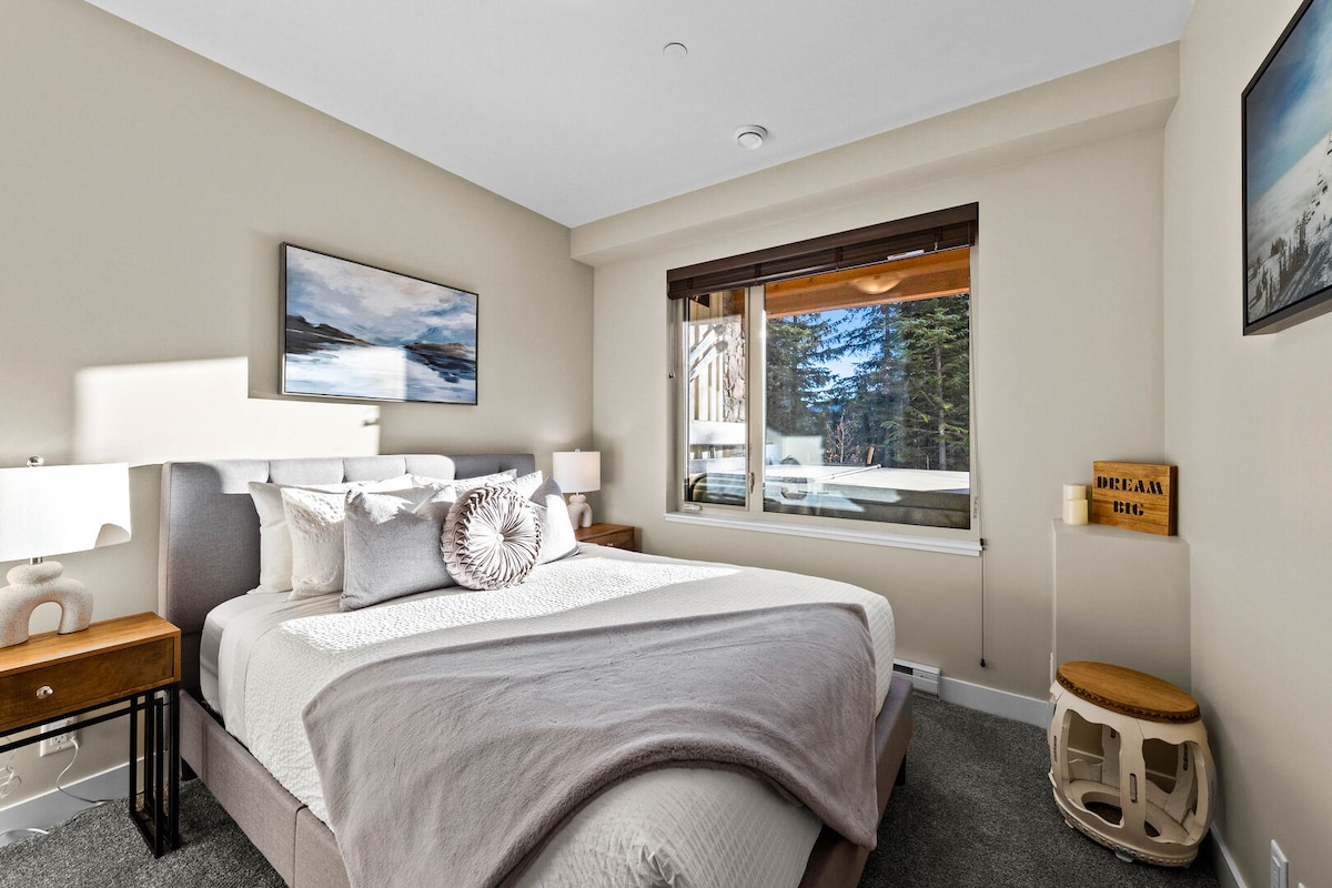 This cozy condo has the warmth of natural wood and high quality furnishings along with large windows. After a day on the mountains, use the large ski locker, put your wet clothes in the dryer, pour a glass of wine and stretch out on the large leather sofa or soak your tired muscles and take in the views in the private hot tub. The well-equipped kitchen is ready for you to prepare meals. Rest easy on comfortable beds with high quality linens and fluffy duvets.