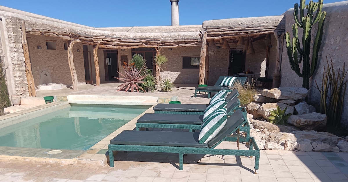 Villa Palmito, located in the Essaouira countryside in El Ghazoua, is a charming holiday home, composed of 2 bedrooms that can accommodate 4 people, and equipped with a swimming pool (7X3). Every detail of the decor has been chosen to create a cocooning and trendy atmosphere highlighting the know-how of local craftsmanship. This single-story villa has a pleasant shaded terrace overlooking the swimming pool surrounded by greenery. It is necessary to have a vehicle.