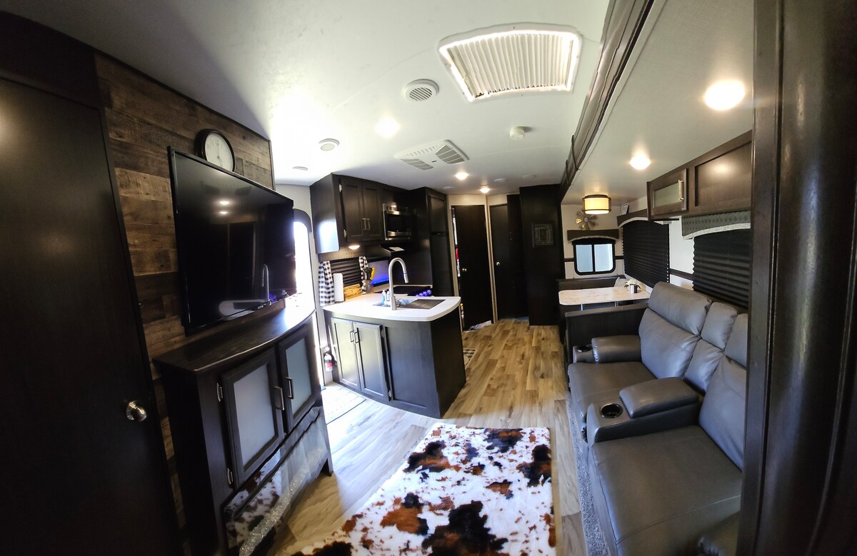 Get cozy and settle into this rustic space. Very nice and clean rental. Sleeps up to 9 with additional fees, 1 and a 1/2 bath with outside entry to the 1/2 bath. Outdoor kitchen with mini fridge and tv. Awning and chairs . Two electric indoor fireplaces for heat or aesthetics, wifi, theater reclined chairs with heat and massage seats. 12 miles from lake Mackenzie, 20 minutes from Caprock Canyons State Park. Located at Silverwind Rv Park in Silverton texas,