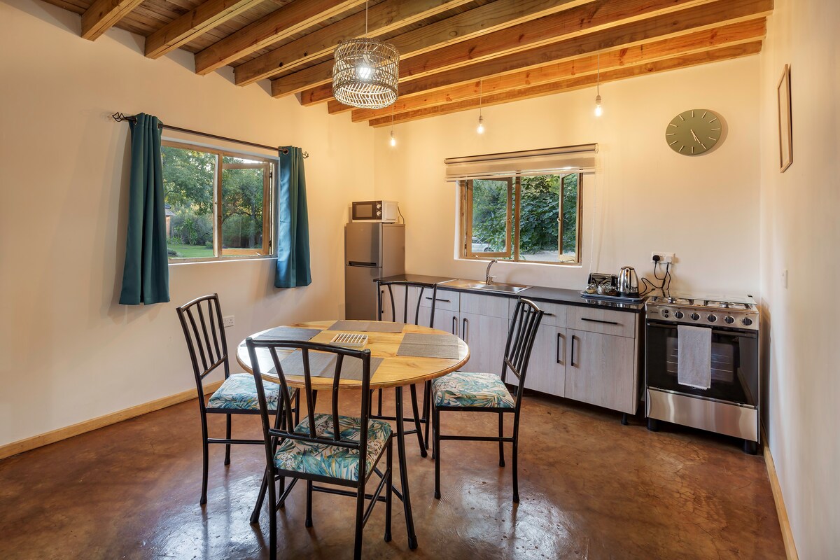 Unwind in a stylish 2-bedroom, en-suite cottage beneath shady teak trees on a quiet road minutes from Victoria Falls town. Enjoy comfort and privacy with a plunge pool, lush garden, and spacious veranda—ideal for morning coffee and sunset drinks. Inside you’ll find AC bedrooms, Wi‑Fi, Netflix, a generous living space, and a fully equipped kitchen. Perfect for adventure, romance, or a family break—close to nature and close to the action.