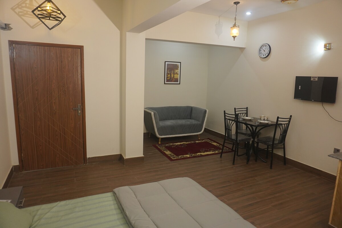 Our Family Suite Room, perfect for up to 4 guests, offers a blend of comfort and convenience. Enjoy air conditioning, a fully-equipped common kitchen with a microwave, and high-speed internet. With 24/7 security, you can relax knowing your family is safe. Ideal for both short and extended stays, our suite provides everything you need for a memorable and worry-free stay.