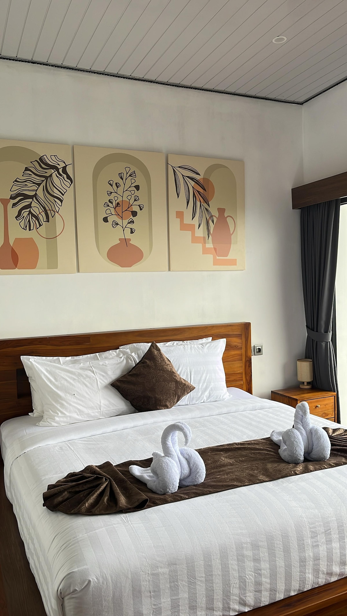 Immerse yourself in traditional design and comfort, complete with fresh linens and towels, A/C, and comfortable beds for a perfect night's sleep. Each room includes a cabinet and towel rack, as well as a private outdoor seating area for relaxation. Take a quick two-minute walk to the beach, where you can catch sight of playful dolphins, or dine at the delicious nearby restaurants and Warungs. Don't miss out on nearby attractions like breathtaking waterfalls and stunning temples.