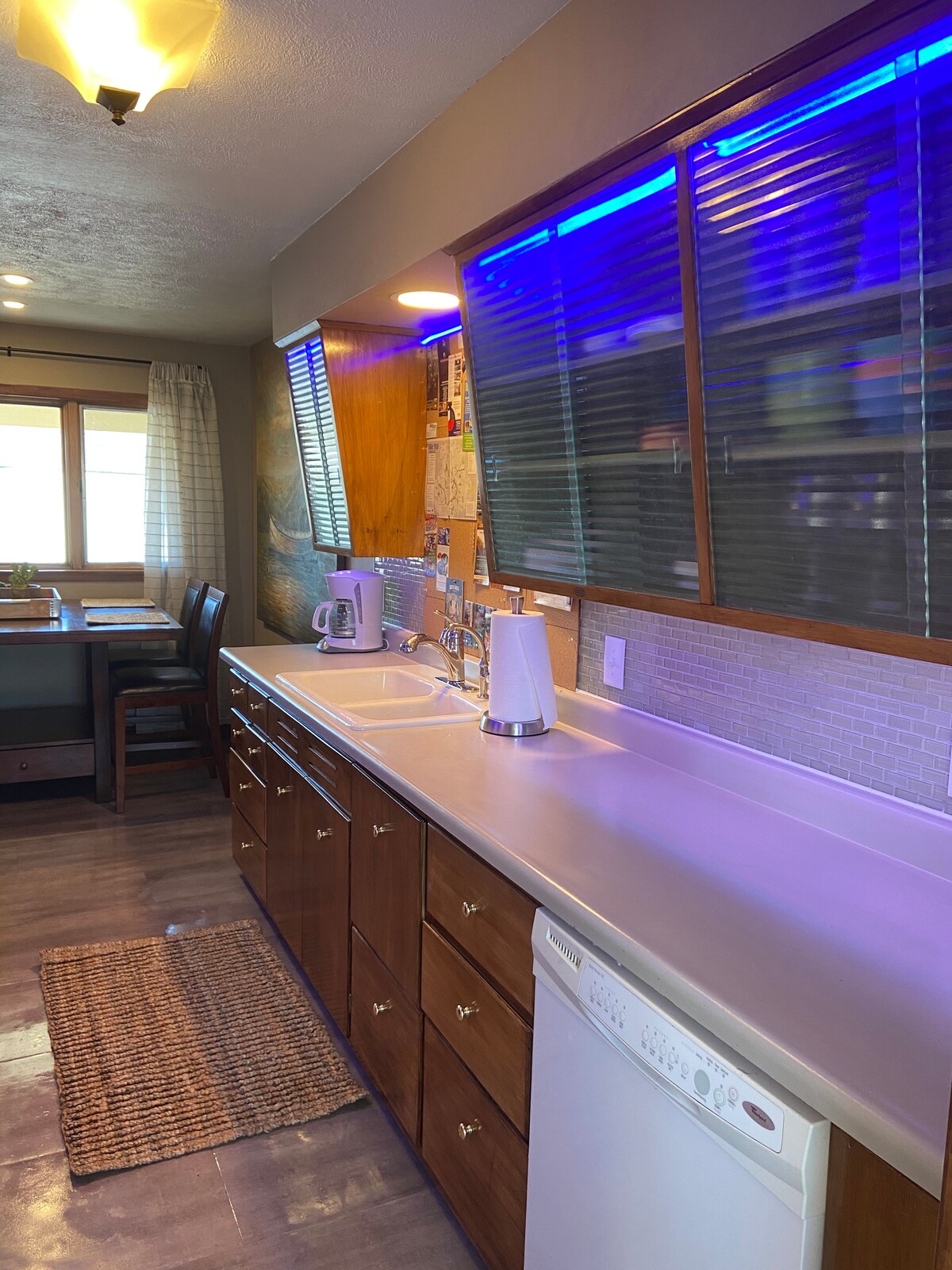 The perfect place to stay for work or play (or a stopover through town)! Curl up in front of the fireplace on the full-sized couch and stream your favorite shows on the 48” LED TV (Netflix only, no cable) or take a break from relaxing and get some work done on the desk. Eat takeout on the high-top table in the kitchen or make your own meal with the full-sized kitchen. The place is fully stocked, from dishes and silverware, fresh towels and sheets, to soap and shampoo.