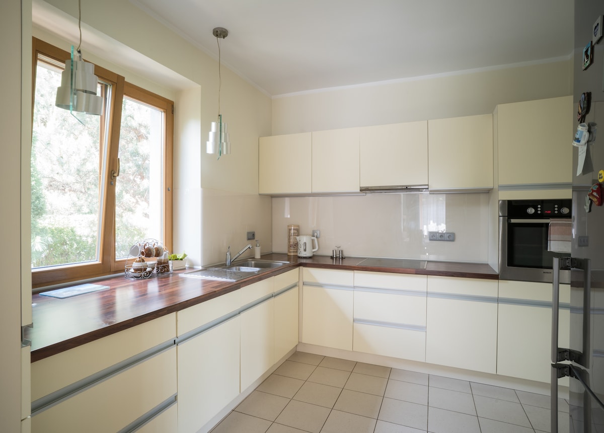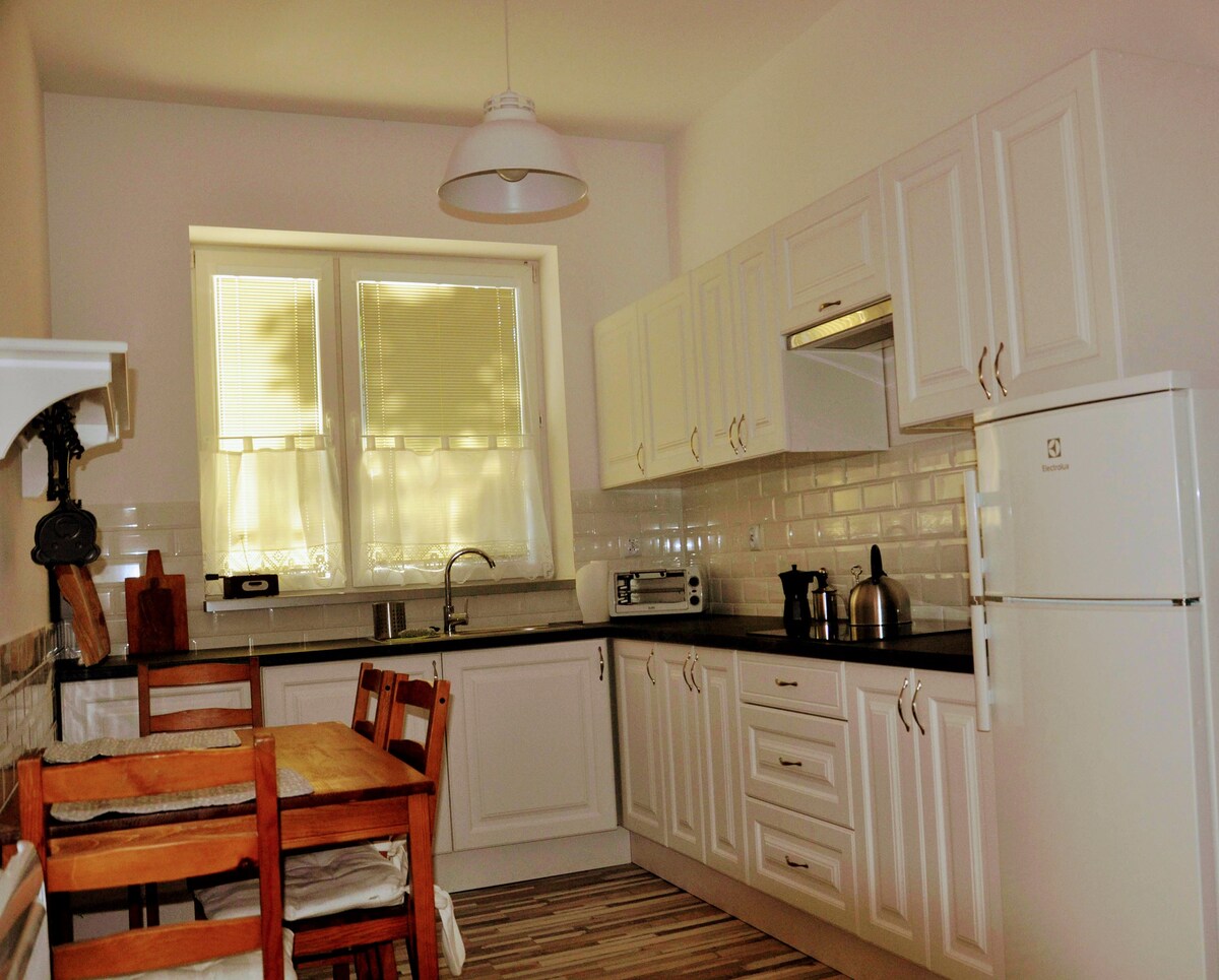 We invite you to our house with a garden. Downstairs, there is a living room with a fireplace, a dining room with a large table, a fully equipped kitchen, and a bathroom with a bathtub. In the attic there is one large room and a bathroom with a shower. The house is located in a quiet area, close to Lake Rusałka, 6 km from the center, 300 m to the bus stop. We provide bicycles. In the garden, you can relax on the terrace and have a barbecue. There is a sandbox and a playhouse for children. Parking for 2 cars. Wi-Fi available.