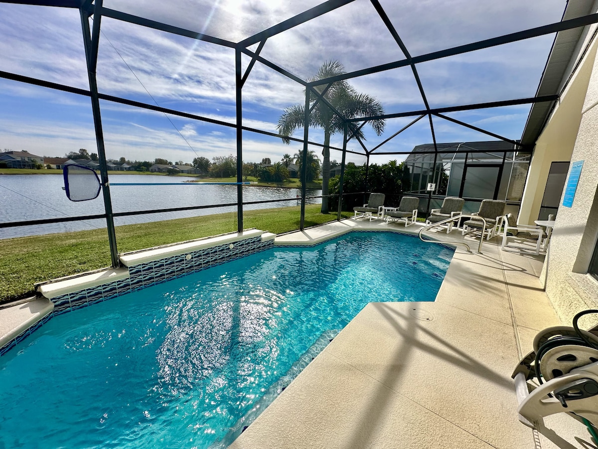 Sit back and relax in this stylish home with all the amenities you need for a fun family getaway. This home has a spacious layout with 3 bedrooms and 2 baths. We have thought of everything so you don't have to-toiletries,washer/dryer, and wifi. Enjoy your morning coffee in the screened in pool area with a beautiful sunrise and lake view or sip a glass of wine while floating in the pool. Just minutes to Theme Parks and major highways, this is the dream home you have been waiting for!