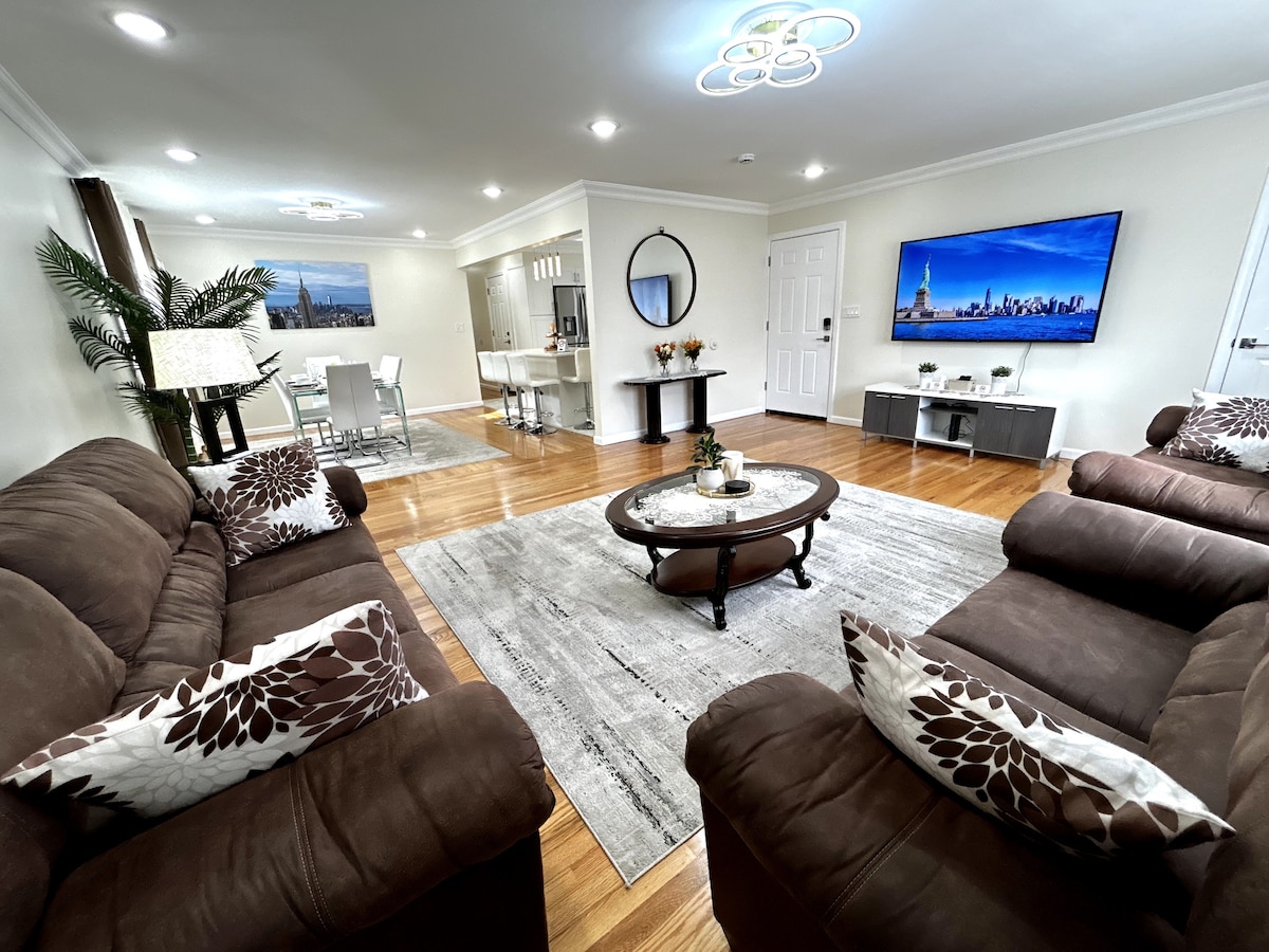 Luxury 3BR/2BA Apartment – Free Parking (For One Car ) Modern, 2nd floor, Just 25 mins from Manhattan. Features stylish living room with recliners, 65” Smart TV, full kitchen, 2 elegant bathrooms, and 3 comfy bedrooms (1 King + 2 Queen). Private entrances and free tandem parking. Walk to parks, shops & restaurants. Perfect for families, business travelers & groups seeking comfort near NYC in a quiet area