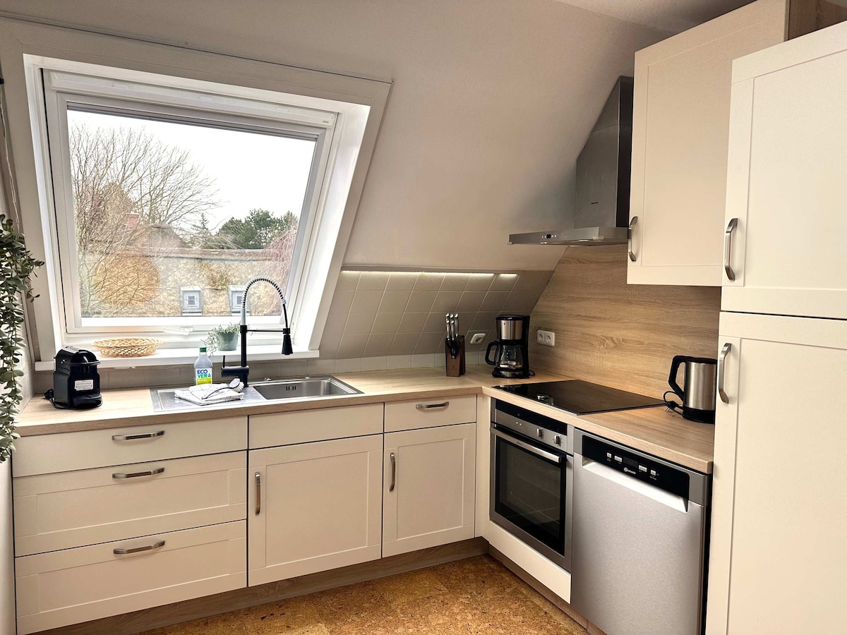 ... and be awakened by the knocking of the woodpecker. Good morning and hello, We would like to introduce you to our lovingly furnished and well-equipped apartment with a separate entrance. The large, cozy apartment is on the upper floor of our house, a 120-year-old thatched, former agricultural building. Here, peace and quiet are guaranteed, as the house is located at the end of a cul-de-sac.