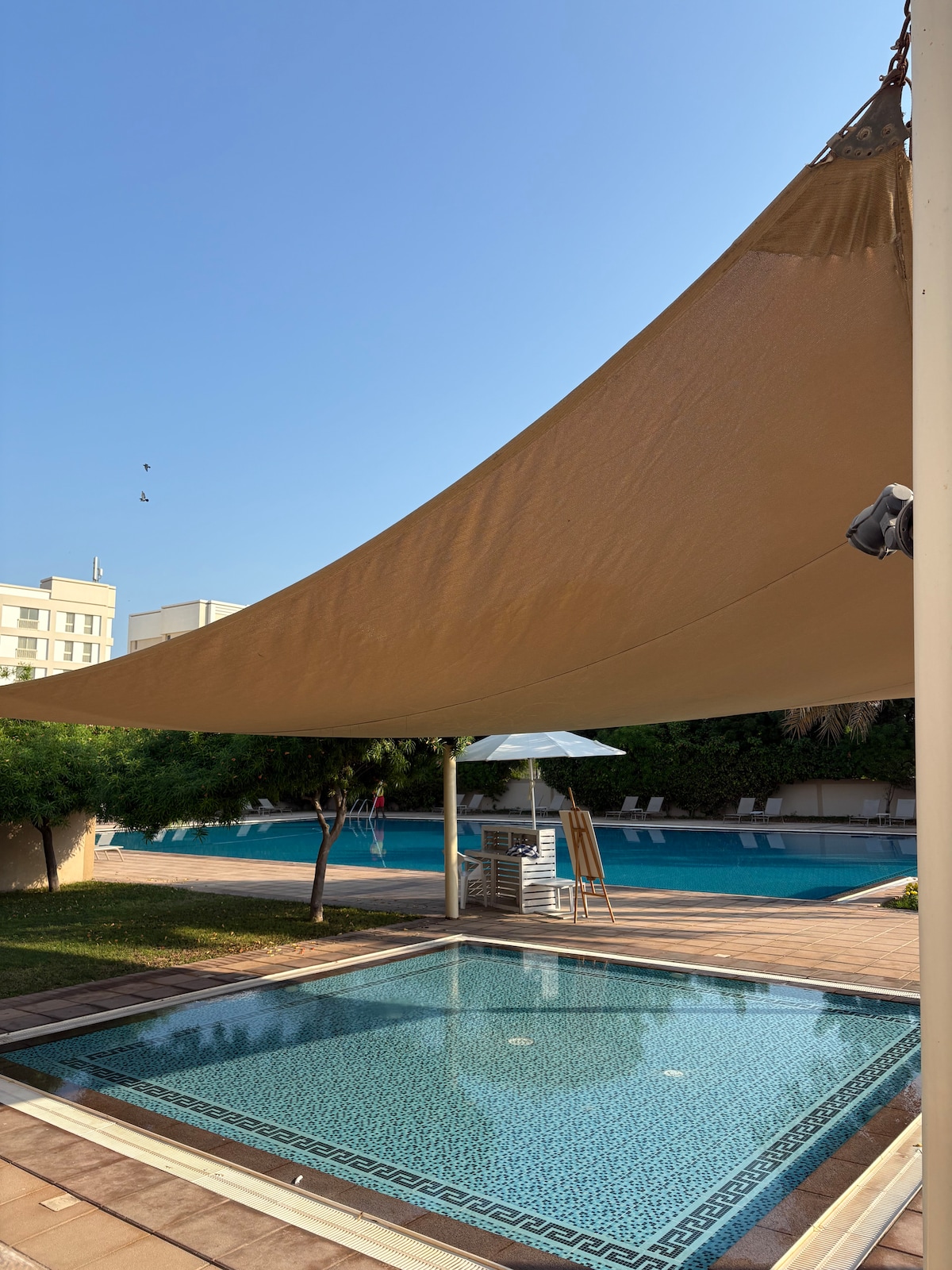My apartment has 1 room with a king bed for 2 people, and a room with a twin bed for 2 people, and 1 small room with a small bed for 1 person, all rooms include a bathroom, and one bathroom is available in the living room, it includes comfortable sofas. In addition a pantry is available with all needed cooking and serving equipments. My Apartment is a part of The Adress Fujairah Hotel, Alaqah. My apartment is on the ground floor where you can enjoy the balcony