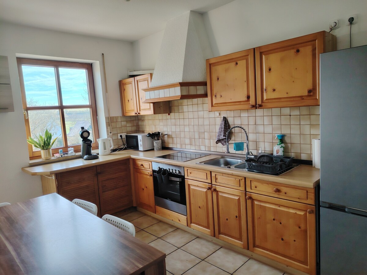 Bright, newly renovated and furnished first floor apartment with 100 sqm • Fully equipped kitchen incl. GSP with spacious dining room • Living room with satellite TV • Bathroom with bathtub, shower and toilet. Bath towels available • 3 bedrooms (one bedroom is also the access to the second bedroom) • Parquet floors, terrace • For families or groups of up to 5 people • Local supply (Edeka, bakery, hairdresser, doctor & pharmacy) in the village (about 3 minutes' walk) • Butcher 3 km