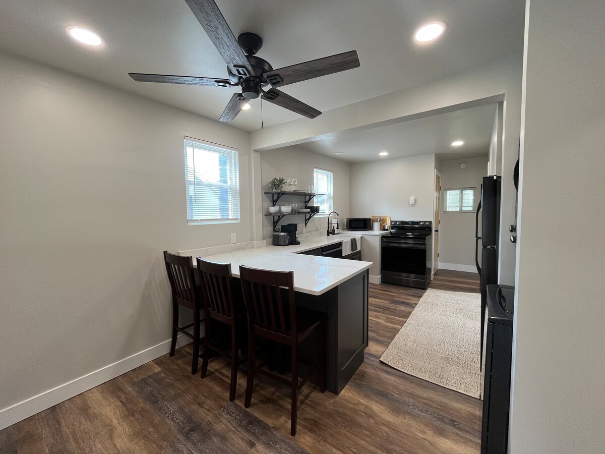 Elegance meets quiet living and plush comfort in this inviting modern office. Our Deluxe Office Guest House is the perfect overnight stay for on-the-go working singles or couples. Featuring a full kitchen, bath, washer & dryer, two work spaces, wi-fi, and TV with electric fireplace and queen size bed.
