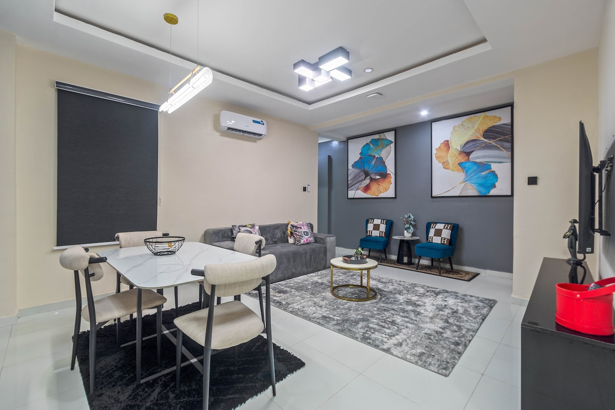 Relax in our cozy, minimal one bedroom 3rd-floor apartment that actually feels like home (but with no chores). 🧼 Daily cleaning & fresh towels on request ☕️ Breakfast bar (complimentary selection of tea and biscuits provided) 🚿 Hot water and uninterrupted power (24/7) 🍳 Fully Fitted Kitchen with top-quality appliances 📺 55” Smart TV with Netflix 🌐 Fast Wi-Fi 🏙️ Rooftop 🏋 Gym ❄️ Air conditioning 🚗 Free on-site parking 🔐 24/7 security 🛋️ Multi-way sofa bed