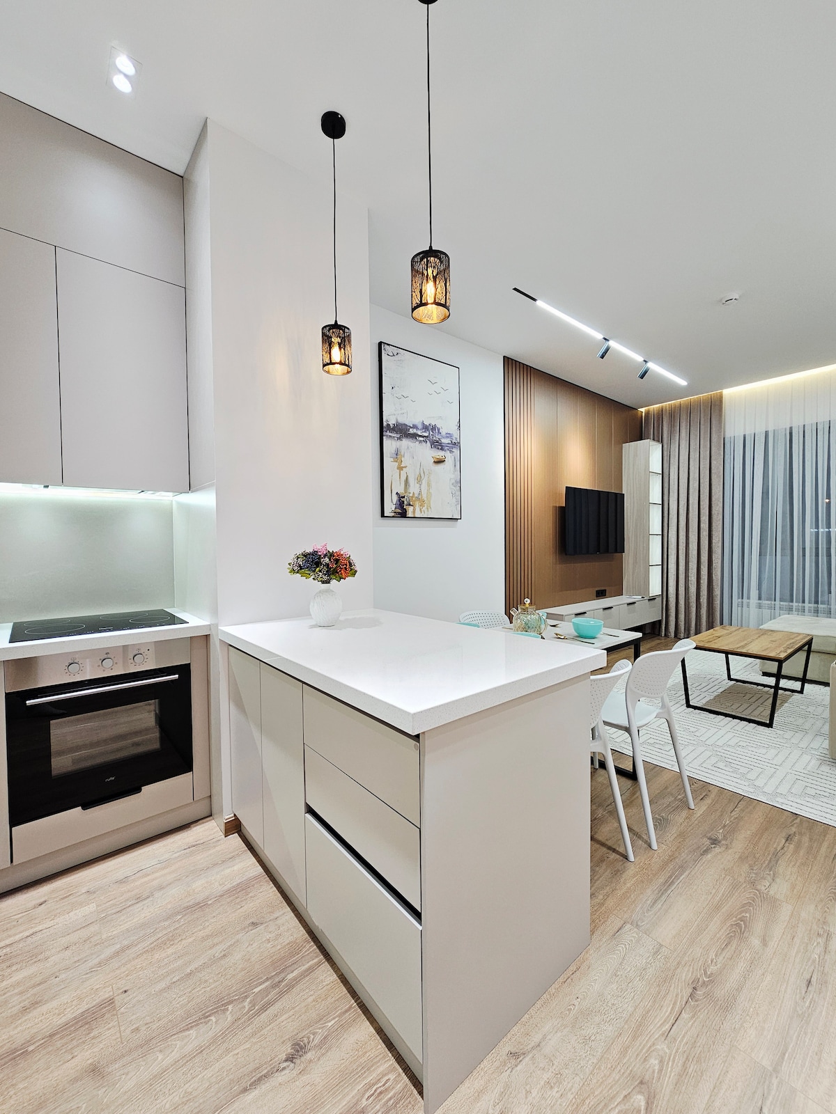 Enjoy a comfortable stay in studio flat! With 30 sqm, it offers enough space for your stay. Fast WLAN,AC included. Fully equipped with all necessary appliances.Cosy bed with a width of 1.65 m, ideal for one person and suitable for a small family.New building with lift and guarded courtyard. The flat is in an excellent location, only 15-20 minutes by taxi from the city centre. In the immediate vicinity you will find:Supermarkets, Sushi bar,pizzeria,Restaurants with national cuisine,Alcohol shops.