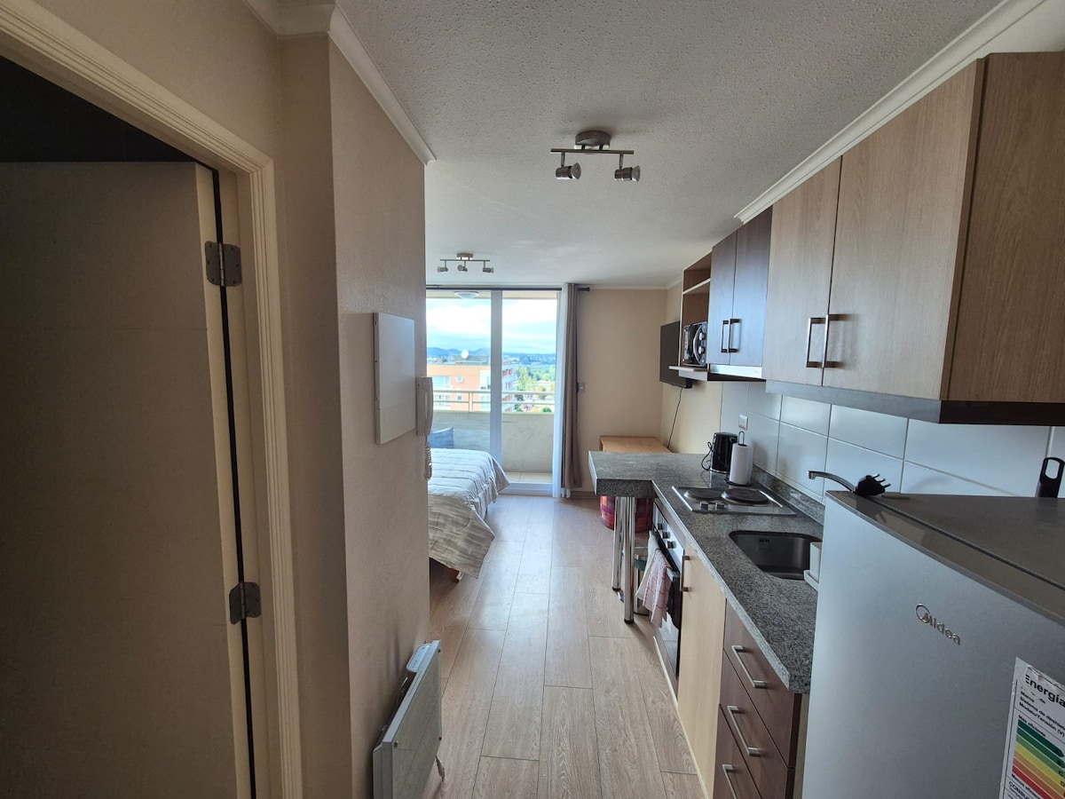 New and cozy executive studio apartment, vintage minimalist style, comfortably equipped for two people; steps from Strip Center with supermarket, pharmacy, mini-market and restaurants, close to Clinic, several Universities and Plaza Dreves. UFRO 15 minutes away, U Catolica 10 minutes away New appliances from the Ursus Trotter line. Bed, bedding, and towels from the Rosen line. Quiet apartment ideal for Home Office. Privileged view from the 12th floor INCLUDES PARKING!