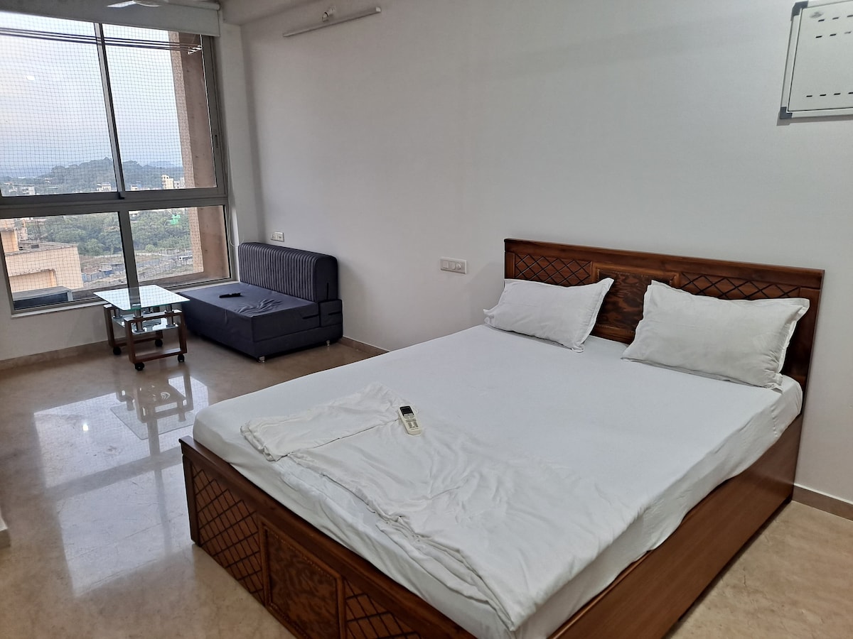 Luxury studio with cozy interior in Hiranandani Estate with stunning creek & Mountain View Amenities • Couple Friendly • Queen-size bed with plush linen and pillows • Smart TV, high-speed Wi-Fi, and air conditioning • Fully equipped kitchenette with refrigerator, kettle, and utensils • Modern bathroom with premium fittings and hot water • Private balcony with panoramic view • 24x7security, elevators, and secure access Ideal for solo travelers, couples,business guests or Small family