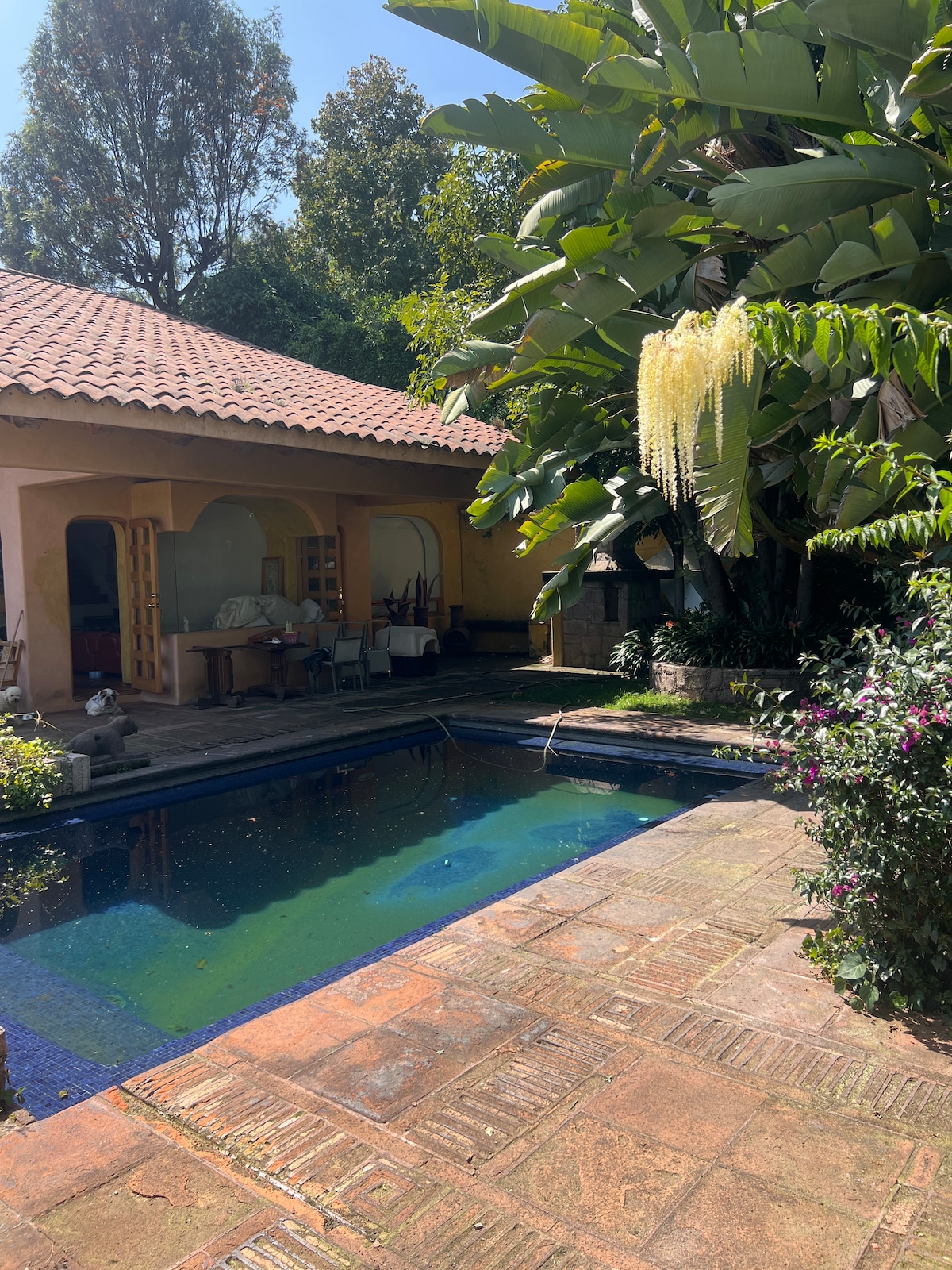"Mexican traditions", located in a Porfirian building in Roma Norte, decorated with references to Mexican traditions. It has: spacious and equipped bathroom; washing machine strategically located; kitchen equipped with grill, microwave, and refrigerator; dining room with table and chairs for four people; living room with sofa and chairs to relax. Master bedroom with king-size bed, closet, TV and air conditioning. Access to the garden from the living room and bedroom. Ideal for extended stays.