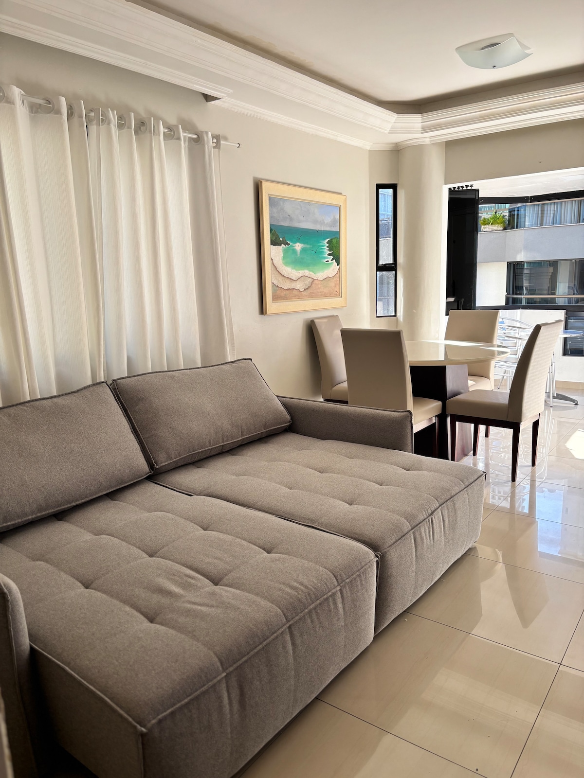 Cozy beachfront, on the beach block, 60 meters from the sand. Easily accessible condominium, no stairs, with elevator and internal garage. Smart lock making self check-in easy. Close to the future floating Hard Rock Café - Dec/25 Super spacious, well decorated and airy, close to supermarkets, restaurants, pharmacies, bars, shopping centers, church, and several stores... We have 1 suite and 2 bedrooms with a shared bathroom, an integrated living room and kitchen, and a large balcony.