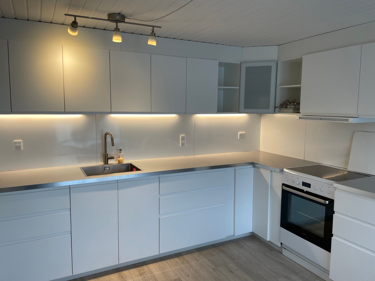 You will have your own private entrance to a bright and spacious basement apartment of approximately 85 m² with living room, bedroom, kitchen and bathroom. No common areas with the owner - you have the entire apartment to yourselves. Only about 9 km to highway E39 10-minute drive to the North Sea (Tversted) 15-minute drive to Hjørring, Frederikshavn and Hirtshals The city has two major supermarkets and one of the country's best bakers. Bed linen, towels and everything else is included in the price, which is paid via Airbnb.