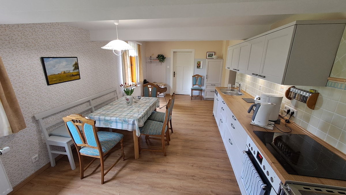 Country house on two levels with 65 sqm! Fully equipped eat-in kitchen, bathroom - toilet, walk-in shower, washing machine, clothes rack; living/sleeping combination in the open attic, terrace with barbecue, garden use by arrangement, parking space for one vehicle, storage space for bicycles. 2x extra beds possible €20/night/person from 5 years. Tips for excursions can be requested if necessary, an information folder is available - otherwise I proceed freely according to the motto "Everything is possible, nothing is required!"