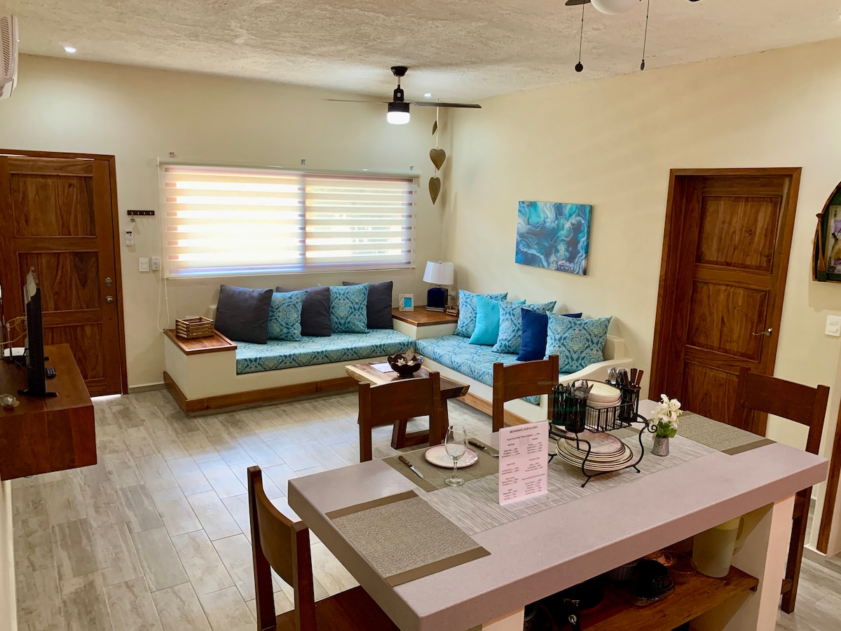 Charming & Private 2BR Apartment in Tulum ♡ Enjoy a stylish and comfortable stay in this fully equipped 2-bedroom apartment. • Easy self check-in from 3:00 PM • Check-out at 11:00 AM • High-speed fiber internet (200 Mbps) — ideal for remote work • Full air conditioning in all areas • 2 king-size beds + 2 sofa beds • 42” 4K Smart TV • 2 private en-suite bathrooms with walk-in closets • Fully equipped kitchen + dining area • Free private parking Perfect for 4 adults, or 2 adults with children.