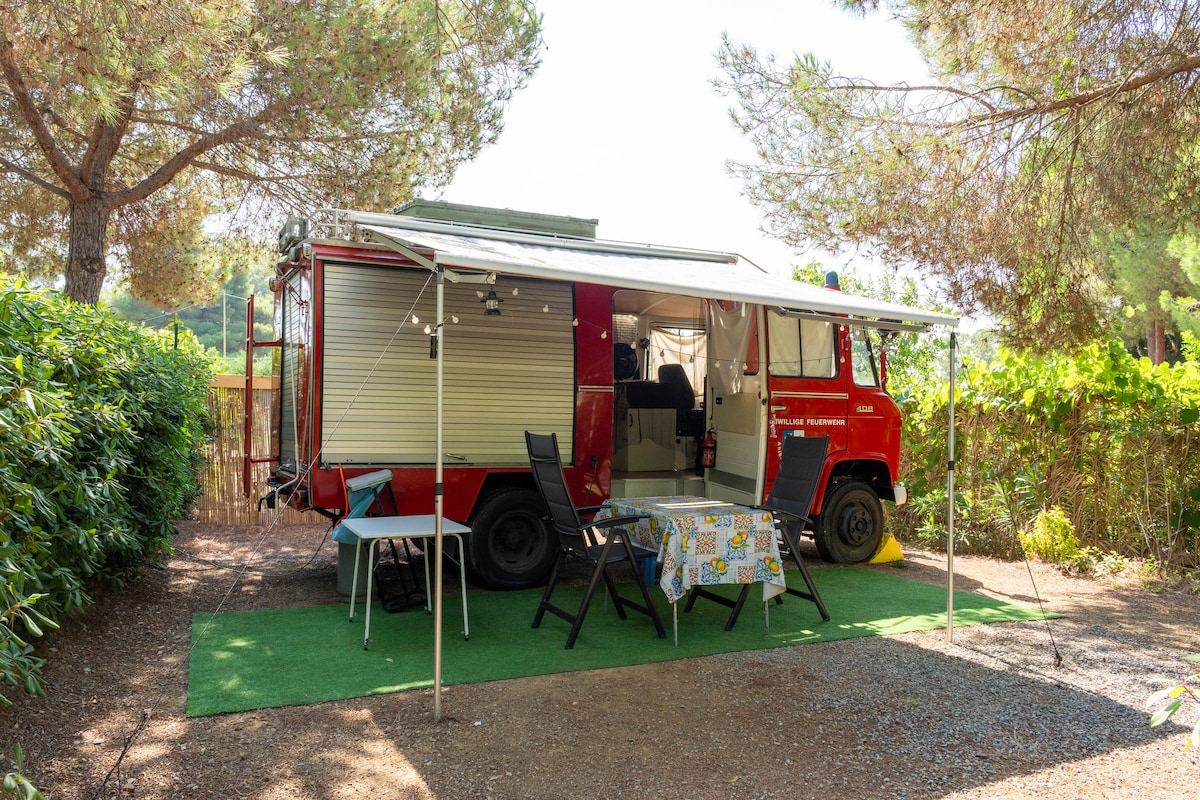 The Fire truck camper is an unusual and truly unique accommodation, created from the restoration of an authentic fire truck and transformed into an original glamping experience. One exclusive feature of this lodging is the rooftop chill-out area, accessed by a ladder – the perfect spot to relax under the starry sky. Amenities: fridge, stove, table and chairs, fan, power supply, pots and pans, crockery, gas, hammock and drying rack. BATHROOM AND SHOWERS ARE IN THE CAMPING PUBLIC BATHROOMS!