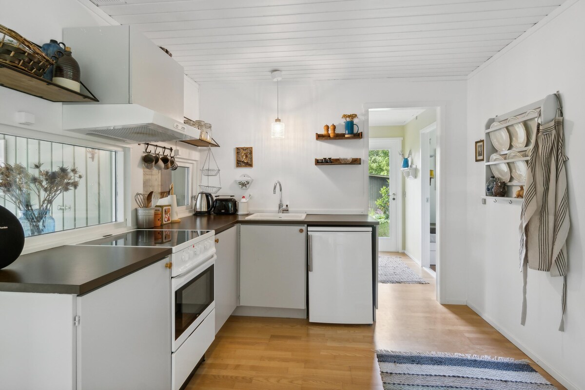 Our super cozy cottage from 1940 has an original cottage atmosphere that will relax your shoulders. Vacation for the whole family with a fire in the fireplace, good food and good times. Beautiful terrace and hammock. Also enjoy the sun room with windows all the way around, so you can eat inside and still be surrounded by nature. Beautiful sandy beach, a walk or bike ride through the forest.