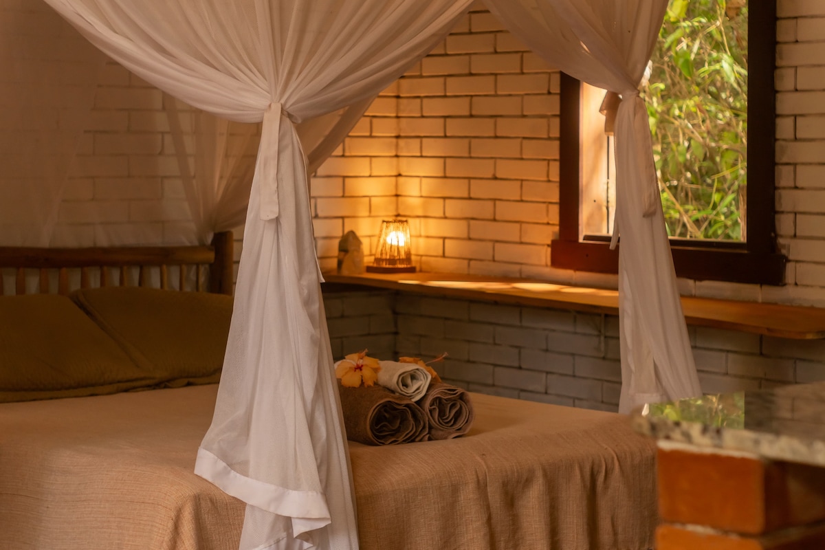 On one of the most preserved beaches in southern Bahia, the Indonesian-style Canto Leela Eco Bungalows is a seaside retreat for those seeking tranquility, comfort and connection with nature. Wake up to the sound of birds and waves. Put your feet right in the sand and enjoy our rustic-style bungalows. The pool invites you to relax. We value tranquility and do not have a television. You can prepare your meals in a shared kitchen.